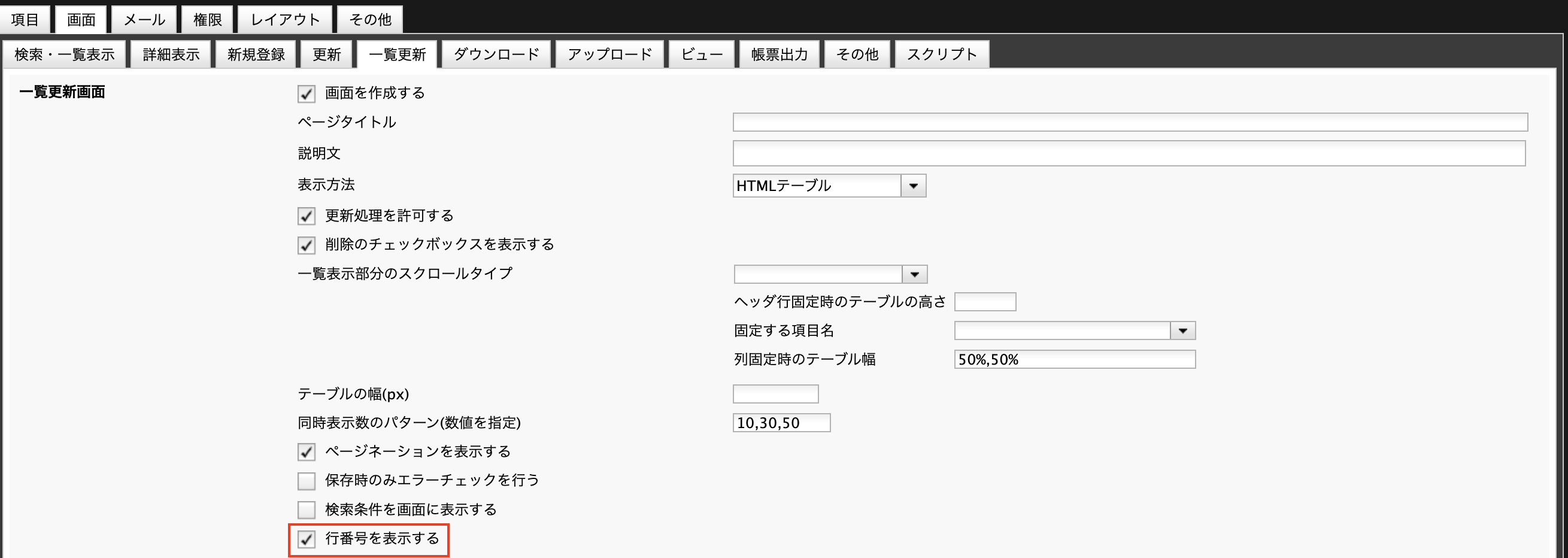 一覧更新画面向けの「行数」と「1行の文字数」