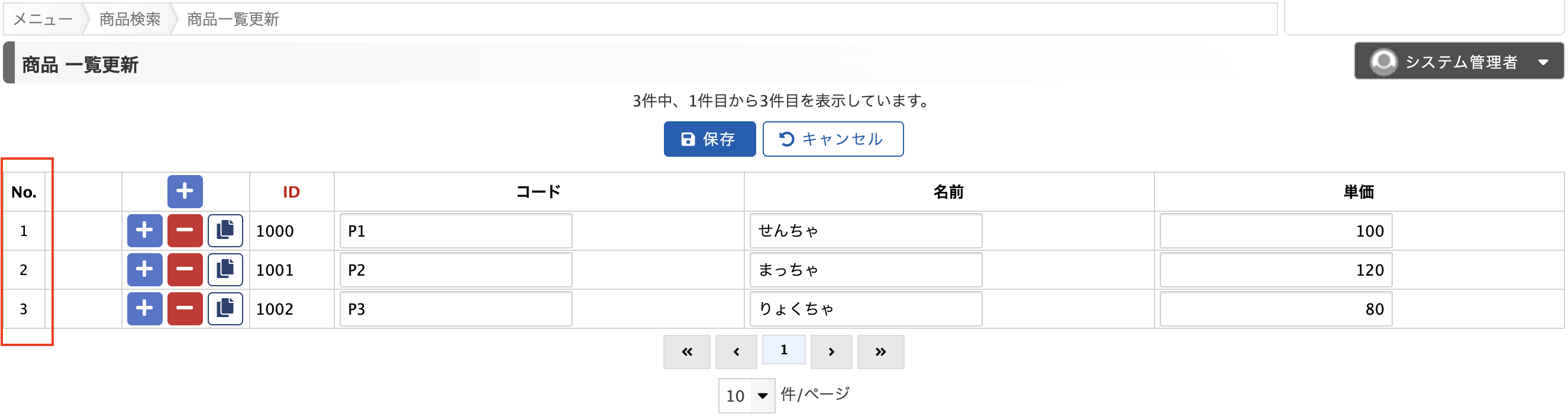 一覧更新画面では表形式でデータの更新・新規登録・削除処理を行うことができます。