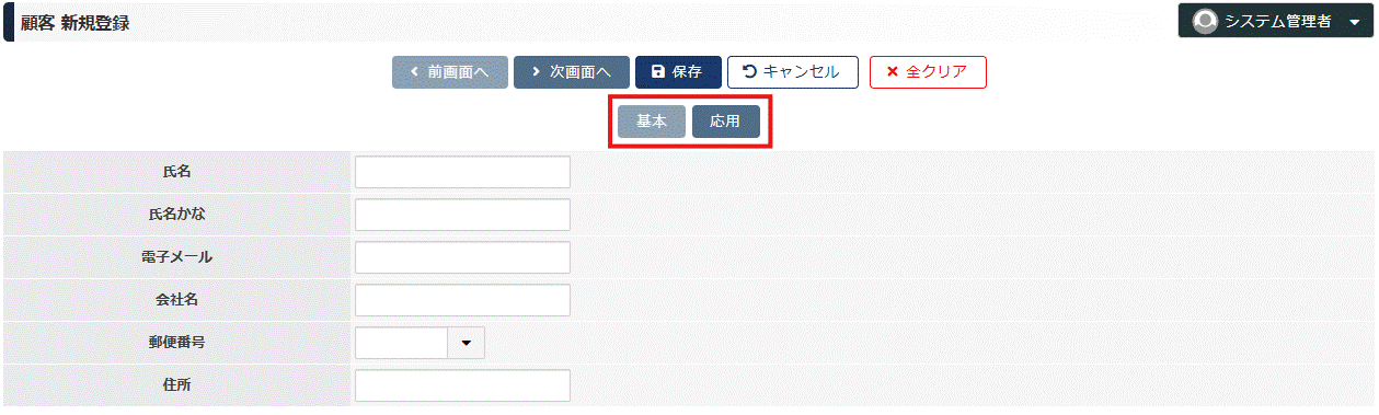 上記の例の場合、「氏名」「氏名かな」などの項目は1つ目の画面に表示され、「問合せ」や「備考」などの項目は2つ目の画面に表示されます。